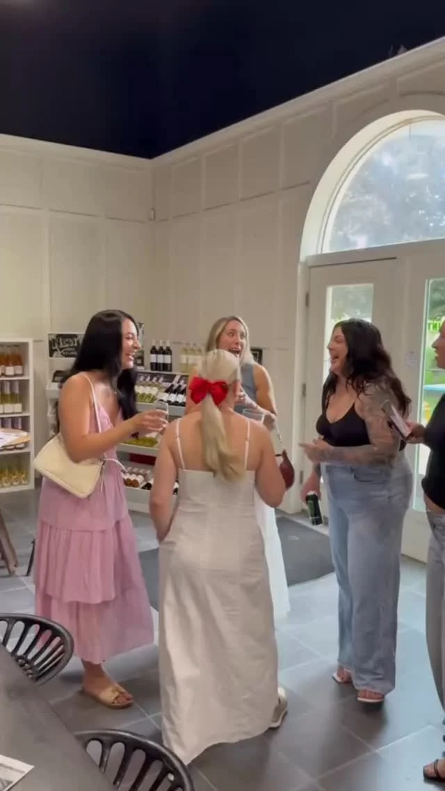 Multiple glasses of white wine on a table with a plant in the foreground. In the background, three women are talking, with one holding a glass. Blurred artwork and a window are also visible.